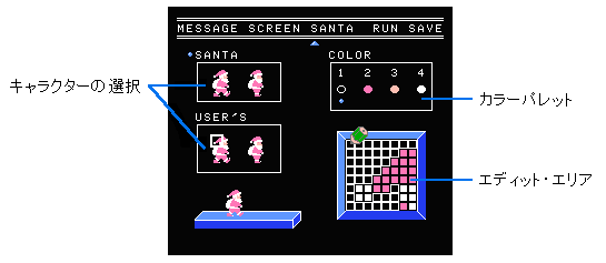 ディスクカードにあらかじめ入力されているキャラクター(SANTA)、あなたのつくるオリジナル・キャラクター(USER’S)を選んで下さい(Bボタン + スタートボタン)。 |