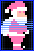 あなたが描こうとするキャラクターが、拡大されています。カラーパレットの色を工夫して楽しいキャラクターを描いて下さい(十字ボタン → Aボタン)。 |
