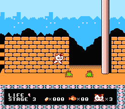 このゲームは、各ステージにある秘密の入口から、雲の上や地下室に行くことができます。雲の上では、小判やアイテムが楽に取れます。地下室には敵がいるけど、この敵は何かアイテムを持っていそうです。やっつけてみましょう。でもこの敵キャラ、どこかで見たことありますね。