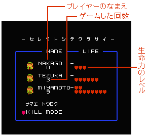 ディスクドライブの作動中には、赤ランプがつきます。その間は本体やスイッチに、絶対に手を触れないでください。 今まであったリンクを作りかえたいときには ゲームをやっている途中でリンクを初めから作りかえたくなったときは、「KILL モード」にハートを合わせ、STARTボタンを押す。 作り直したいリンクにハートを合わせ、STARTボタンを押すと名前が消える。消したら「KILL オワル」にハートを合わせて、STARTボタンを押そう。あとは最初のときみたいにして、名前を入れ直せばいいんだ。