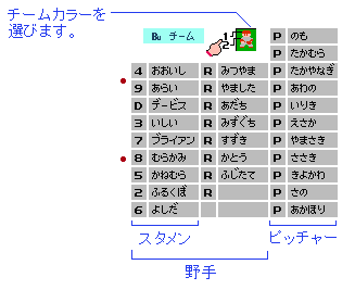 | Aボタンを押すと選手のデータがスクロールします。 |