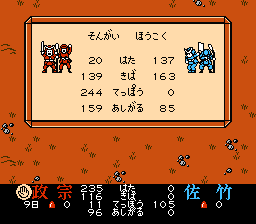 軍事関係のデータは、セレクトボタンを押すと表示され、兵の強さや数がわかるようになっています。なお、足軽は軍事命令の“へいあつめ”、他の兵力は商人から武器を買って増やすことができます。 |