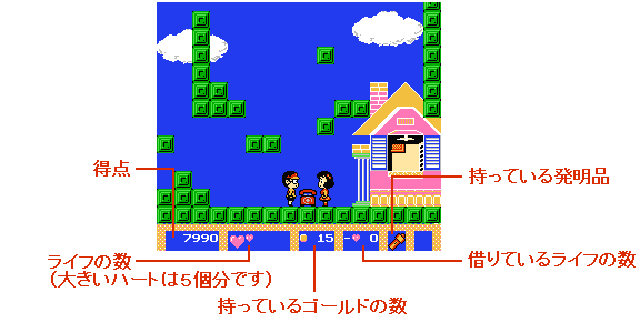 | ★ | ライフがなくなるとゲームオーバーです。でも、ある発明をしておけば……? |