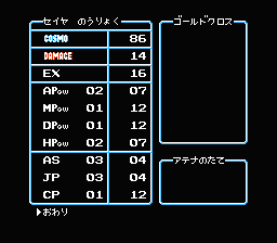 | 星矢は聖衣を身につけると能力はアップするが、COSMOの消費も多くなるョ。移動モードでは脱いでCOSMOの消費を少なくした方が、有利に闘える。 |