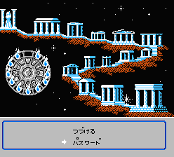 黄金聖衣を倒し、その宮をクリアするとこの画面に変わり、そのままゲームを続けるか、途中でやめるかを選択します。途中でやめたいなら“パスワード”を選んでSTARTボタンを押して、パスワードを見て、書きとめましょう。