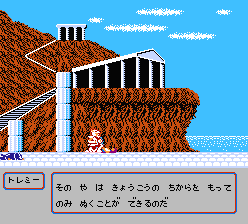 ファミコン本体に、黄金伝説<完結編>のROMカセットを差し込んだら電源を入れよう、そうするとすばらしいオープニング画面のスタートだ。
