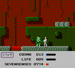 “LIFE”.“COSMO”共に敵の攻撃を受けると減り、0以下になると戦闘不能となる。 “COSMO”の量で攻撃力がちがってくる。さらに移動画面ではパンチのとどく範囲も大きくなる。 “SEVEN SENSES”は移動画面で雑兵を倒したり、各宮をクリアしたりすると、一定量増えます。 |