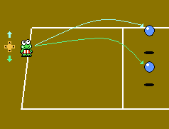 テトラスでは、打つと同時に十字ボタンの上か下をおすと、上下のコートにボールを返します。 |