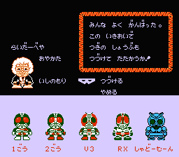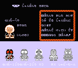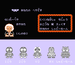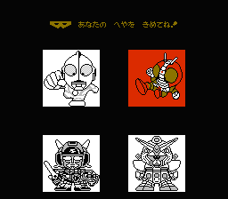| [6] | 自分の部屋を決めよう 自分の好きなヒーローの部屋を十字キーで選んでカラーにしてからAボタンで決定だ。 (画面ではライダー部屋を選んだぞ!)