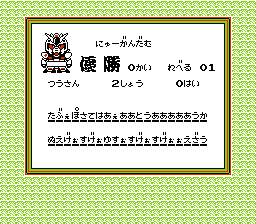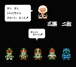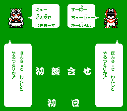 | [10] | みんなまとめて親方のゲキをもらおう 部屋が勝つとほめてもらえるし、敗けるとお説教されてしまうぞ。ここでAボタンをおすと、2プレイヤー側の勝敗結果が見られるぞ。