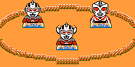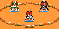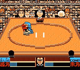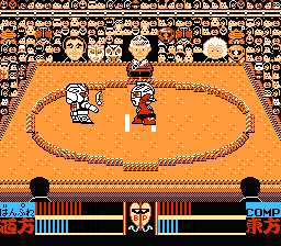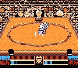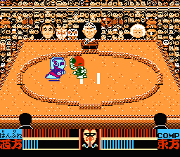 | ● | 投げ (十字キー:相手のいる逆方向+Bボタン) 組んでいるとき十字キーを相手の逆方向に入れてBボタンを押す。土俵際に追いこまれたときは形勢逆転にも使えるが、もっと大切なことがあるんだ。それは下記「必殺技」を見てね。 |