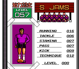 | S JAMS パス力(7)、キック力(9)、タックル(6)、スタミナ(7)。防御よりも攻撃に強い。レベルは57 |