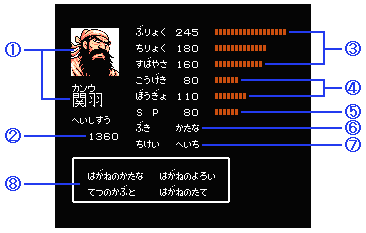 | ③ | 武将の持つ「武力」「知力」「素早さ」のデータをグラフと数字で表示しています。この数値は特殊なアイテムなどを装備しない限り変化しません。 |