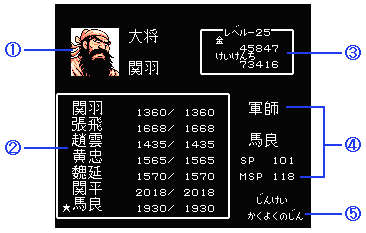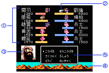 | ① | この戦闘に加わった武将の名前とそのキャラクター、そして残りの兵士数が数字とグラフで表示されています。この兵士数が0になると、その武将は戦闘不能になります。 |