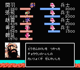 シナリオが進につれて劉備軍は、村や城で武将を仲間にひきいれどんどん大きくなっていきます。その中で移動できるのはあなたが選んだ7人の武将です。どんどん仲間が増えていくに従って、あなたはいろいろな仲間と隊列を組みたくなるでしょう。また、作戦上、連れていく仲間を変えたいときも出てくるでしょう。そんな時、この編制所にきて連れていく武将を変えることができます。