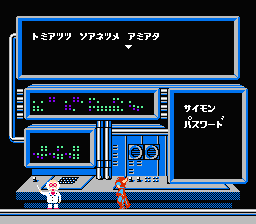 ゲームを途中で終わらせたい時は、シナモン博士のコンピュータールームに戻るんだ。シナモン博士がパスワードを教えてくれるから、それをメモしておくと、電源を切ってもゲームオーバーに時に持っていたアイテムで、再びゲームを始めることができるんだ。